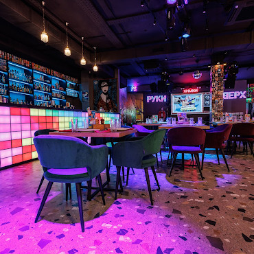 Заведение вблизи парка им. 50-лет Октября, в котором есть удобная Welcome зона, банкетный зал с круглыми столами и золочеными колоннами.