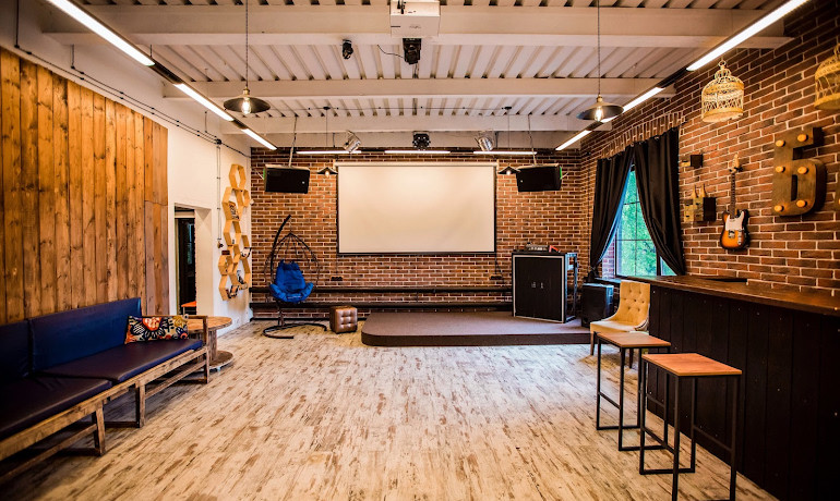 Лофт «КомоД» - это современный зал с дизайнерским интерьером, который занимает целый этаж площадью 105 кв. м. Расположен зал на территории завода Компрессор.