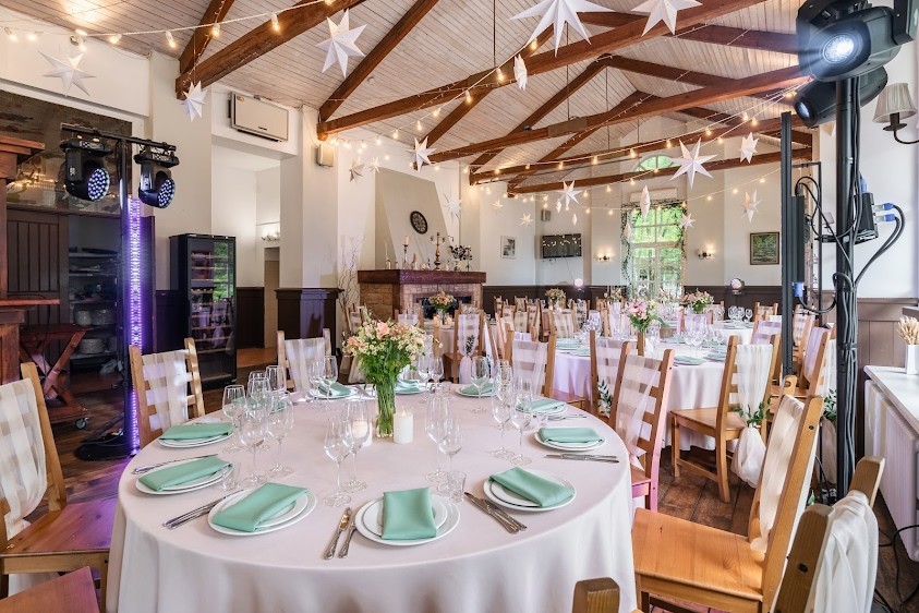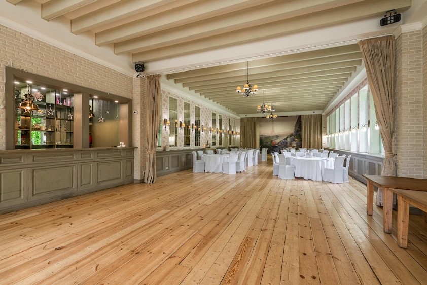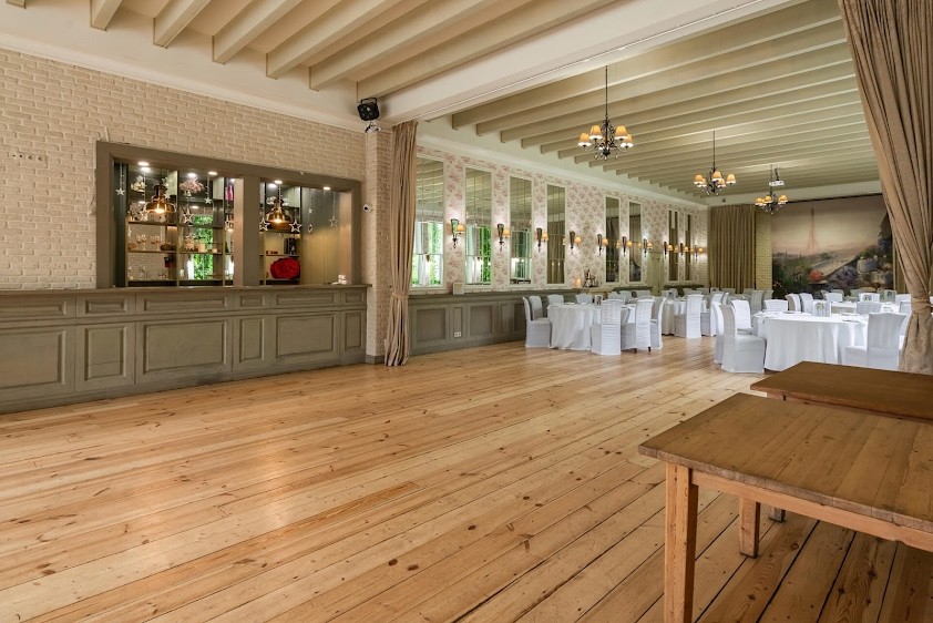 Ресторан идеально подходит для свадеб в стиле бохо, рустик и эко, а площадка позволяет комфортно разместить до 60 гостей. Зал не требует особых декораций, добавив зелени, цветов, даже полевых, или стилистической атрибутикой, позволит приблизить его к выбранной тематике.